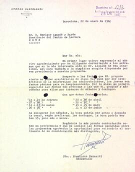 L'Ateneu Barcelonès proposa diferents dates per al cicle de conferències "Visión Histórico cultural de España". Data del document: 22-01-1960