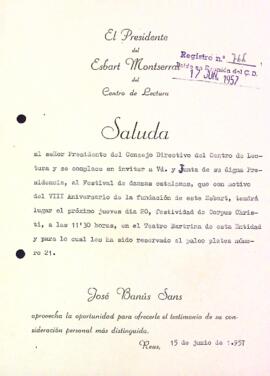 Josep Banús Sans, president de l'Esbart Montserrat, convida al Consell Directiu del Centre de Lectura al festival de danses catalanes que se celebra amb motiu del vuitè aniversari de la fundació de l'entitat. Data del document: 15-06-1957