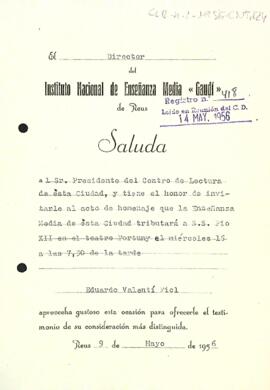 Eduard Valentí convida Enric Aguadé a l'acte d'homenatge a Pio XII al Teatre Fortuny.