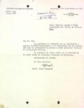 Guido Burgada, vice-director de l'Istituto Italiano di Cultura, agraeix l'obsequi d'un exemplar de la Revista del Centre de Lectura. Data del document: 09-12-1957