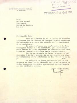 Mario Forte informa Enric Aguadé de la possibilitat de dur a terme al Centre de Lectura una conferència sobre Dante de la Dra. Giuseppina Ronchi nomenada Genesi e struttura della Divina Comedia".