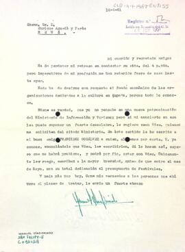 Manuel Díaz es disculpa amb Enric Aguadé pel retard en respondre la seva carta i li recomana escriure al ministeri d'informació i educació sol·licitant la seva presència i aconseguint així poder gaudir, finalment, de la seva actuació.