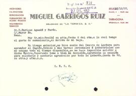 Miguel Garrigós Ruiz explica els motius pels quals s'ha donat de baixa com a soci del Centre de Lectura. Data del document:19-12-1957