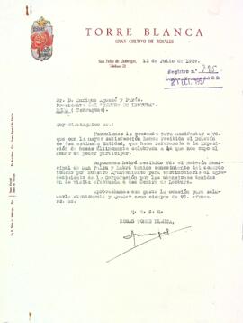 L'empresa Torre Blanca, gran cultivo de rosales, agraeix al Centre de Lectura l'obsequi d'un exemplar de la Revista del Centre de Lectura, i adjunta un butlletí municipal de Sant Feliu de Llobregat. Data del document: 13-07-1957