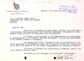 Vicente Cacho Viu, de la Sección de Actos Culturales de la Dirección General de Información, proposa al Centre de Lectura col·laborar en una exposició, sota el tema "Escuela de Madrid". Adjunta les condicions generals i 2 fulls de mà de l'exposició. Data del document: 02-03-1957