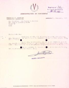Virto Administración de Conciertos lamenta que pressupost econòmic del Centre de Lectura no permeti acceptar les seves ofertes. Data del document: 13-12-1957
