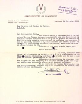 Maria Solanich, de Virto Administración de Conciertos, proposa al Centre de Lectura un concert amb el conjunt alemany Roman Schimmer Trio. Data del document: 28-11-1957