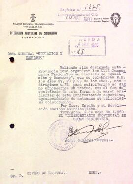 Eduardo Serres, vicesecretari provincial d'Obres Sindicals, demana al Centre de Lectura un trofeu per als XIII Campeonatos Nacionales de Ciciclismo de "Educación y Descanso". Data del document: 02-05-1960