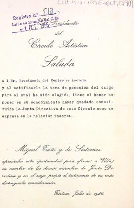 Carta del Círculo Artístico de Tortosa al president del Centre de Lectura comunicant la formació de la nova junta directiva