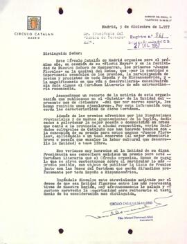 El Círculo Catalán de Madrid demana un premi per als Jocs Florals que estan organitzant. Data del document: 09-12-1957
