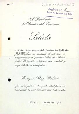 Invitació del Centre de Comerç de Reus al president del Centre de Lectura