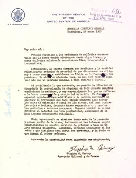Stephen M. Carney, Agregat cultural i de premsa del Consulat Americà, comunica les noves normes per al préstec d'audiovisuals. Data del document: 29-01-1960