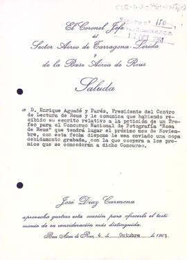 José Díaz informa Enric Aguadé de l'enviament d'una copa gravada la qual podrà ser entregada als premiats del Concurs Nacional de Fotografia "Rosa de Reus".