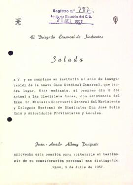 Juan-Amado Albouy Busquets, Delegat Comarcal de Sindicats, convida al Centre de Lectura a la inauguració de la nova Casa Sindical Comarcal. Data del document: 02-07-1957