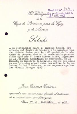 Juan Tintorer Tintorer, delegat de la Caja de Pensiones para la Vejez y de Ahorros, agraeix al Centre de Lectura que els hagi cedit la màquina de projeccions per a la conferència de Tomás Ribera Piris a l'Escuela de Maestría Industrial. Data del document: 10-12-1957.