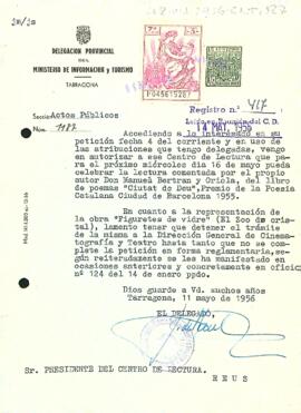 Josep M. de March comunica l'autorització per a celebrar la lectura comentada de "Ciutat de Déu" per Manuel Bertran i Oriol, i, per altra banda, informa que malauradament encara no ha sigut possible autoritzar la representació de l'obra "Figueretes de vidre" per absència d'alguns dels tràmits imprescindibles.