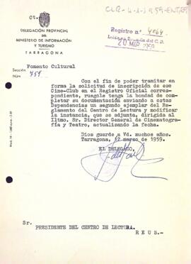 Carta del delegat provincial d'informació i turisme de Tarragona al president del Centre de Lectura