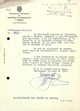 Josep M. de March comunica a Enric Aguadé que la Direcció General de Cinematografia ha informat que ha inscrit el Cineclub del Centre de Lectura al Registre Oficial de Cineclubs.