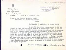 Carta del delegat regional de l'il·lustre Col·legi Nacional de registradores de la propietat d'Espanya al president del Centre de Lectura