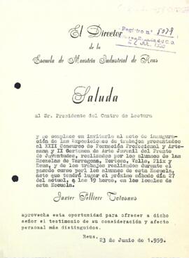 Xavier Pellicer convida al president a l'acte d'inauguració de les exposicions de treballs presentats al XIII Concurs de Formació professional i artístic i al II Certamen d'art juvenil del Front de Joventuts de les escoles de Tarragona, Tortosa, Valls, Flix i Reus.