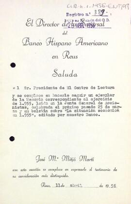 Carta del director de la sucursal del Banc Hispano Americano de Reus al president del Centre de Lectura