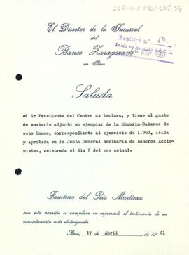 Faustino del Rio informa Enric Aguadé del donatiu d'un exemplar de la memòria-balanç de l'exercici 1960 de l'entitat que dirigeix.