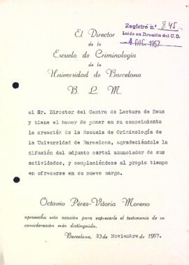 Octavio Pérez-Vitoria Moreno, informa al president del Centre de Lectura de la creació de l'Escula de Criminología de la Universidad de Barcelona, del qual ell n'és el director. Data del document: 23-11-1957