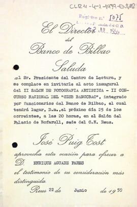Invitació del director del Banco de Bilbao al president del Centre de Lectura