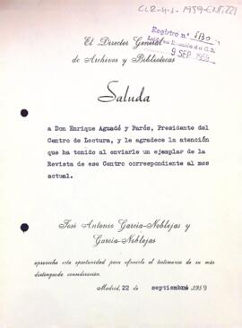 José Antonio García-Noblejas agraeix a Enric Aguadé el donatiu d'un exemplar de la Revista del Centre de Lectura.