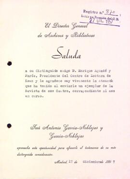 José Antonio García-Noblejas y García-Noblejas, Director General de Archivos y Bibliotecas, agraeix al Centre de Lectura l'obsequi d'un exemplar de la Revista del Centre de Lectura. Data del document: 17-12-1957