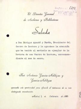José Antonio García-Noblejas y García-Noblejas, Director General de Archivos y Bibliotecas, agraeix l'enviament d'un exemplar de la Revista del Centre de Lectura, corresponent al mes de gener. Data del document: 01-02-1960