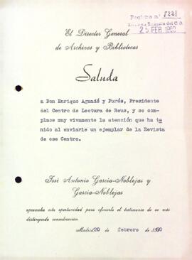 José Antonio García-Noblejas y García Noblejas agraeix a Enric Aguadé Parés l'obsequi d'un exemplar de la Revista del Centre de Lectura. Data del document: 20-02-1960