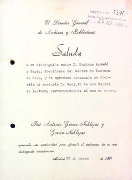 José Antonio García-Noblejas y García-Noblejas, Director General de Archivos y Bibliotecas, agraeix a Enric Aguadé Parés l'obsequi d'un exemplar de la Revista del Centre de Lectura. Data del document: 28-03-1960