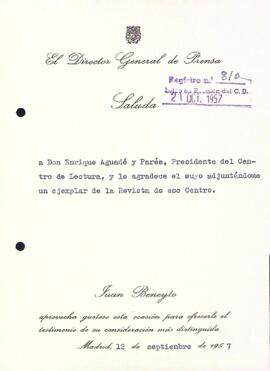 Juan Beneyto, Director General de Premsa, agraeix al Centre de Lectura l'obsequi d'un exemplar de la Revista del Centre de Lectura. Data del document: 12-09-1957
