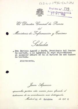Juan Aparicio agraeix el donatiu d'un exemplar de la Revista del Centre de Lectura.