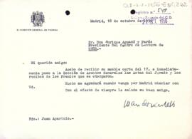 Juan Aparcio comunica a Enric Aguadé l'entrega a la Secció d'assumptes general, de les actes del jurat i dels rebuts dels premis atorgats.