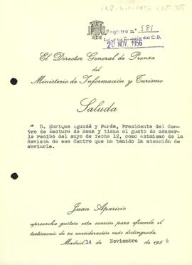 Juan Aparcio agraeix a Enric Aguadé l'enviament de la Revista del Centre de Lectura.