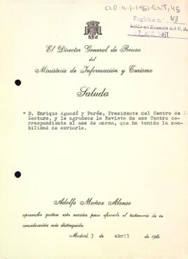 Carta d'agraïment del director general de premsa al president del Centre de Lectura