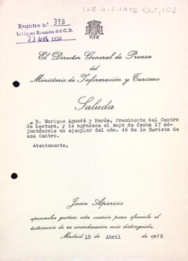 Jua Aparicio agraeix el donatiu d'un exemplar de la Revista del Centre de Lectura.