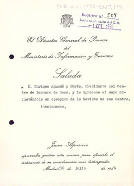 Carta d'agraïment del director general de premsa del Ministeri d'Informació i Turisme al president del Centre de Lectura