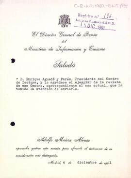 Carta d'agraïment del director general de premsa del Ministeri d'Informació i Turisme al president del Centre de Lectura