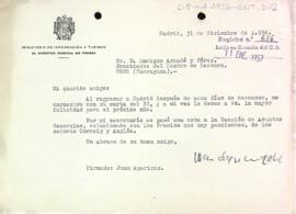 Juan Aparicio confirma a Enric Aguadé la recepció de la carta desitjant felicitat per a l'any vinent i li comunica la gestió pendent relacionada amb els premis del Sr. Correig i Anglès.