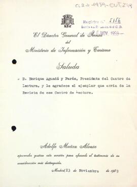 Carta d'agraïment del director general de premsa del Ministeri d'Informació i Turisme al president del Centre de Lectura