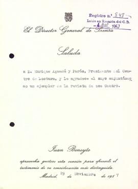 Juan Beneyto, Director General de Prensa, agraeix a Enric Aguadé Parés l'obsequi d'un exemplar de la Revista del Centre de Lectura. Data del document: 29-11-1957