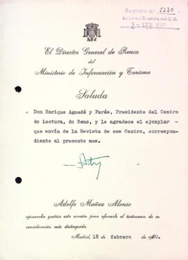 Adolfo Muñoz Alonso, Director General de Premsa del Miniseri d'Informació i Turisme, agraeix a Enric Aguadé Parés l'obsequi d'un exemplar de la Revista del Centre de Lectura. Data del document: 18-02-1960