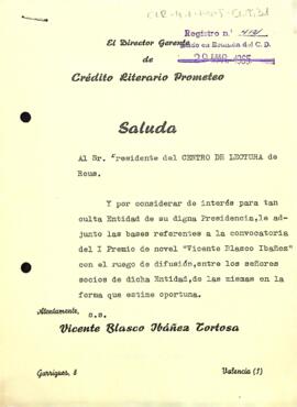 Carta del director gerent de Crédito Literario Prometeo al president del Centre de Lectura