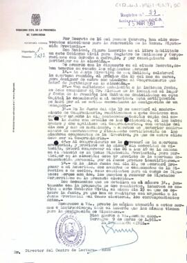 Carta del govern civil de la província de Tarragona al president del Centre de Lectura