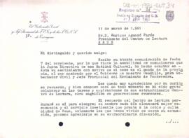 José González-Sama comunica a Enric Aguadé el seu nou nomenament i li agraeix tots aquests anys de col·laboració amb el Centre de Lectura