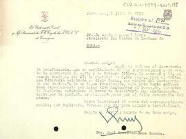 José González-Sama informa Enric Aguadé que ha rebut la notícia per part del secretari de beneficència de l'entrega de 5.000 pessetes per al Certamen Literari amb motiu del centenari, el qual aprofita per felicitar-lo per la seva bona organització.