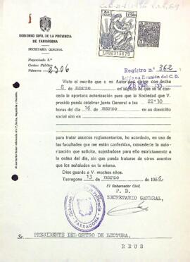 Carta del governador civil de Tarragona al president del Centre de Lectura